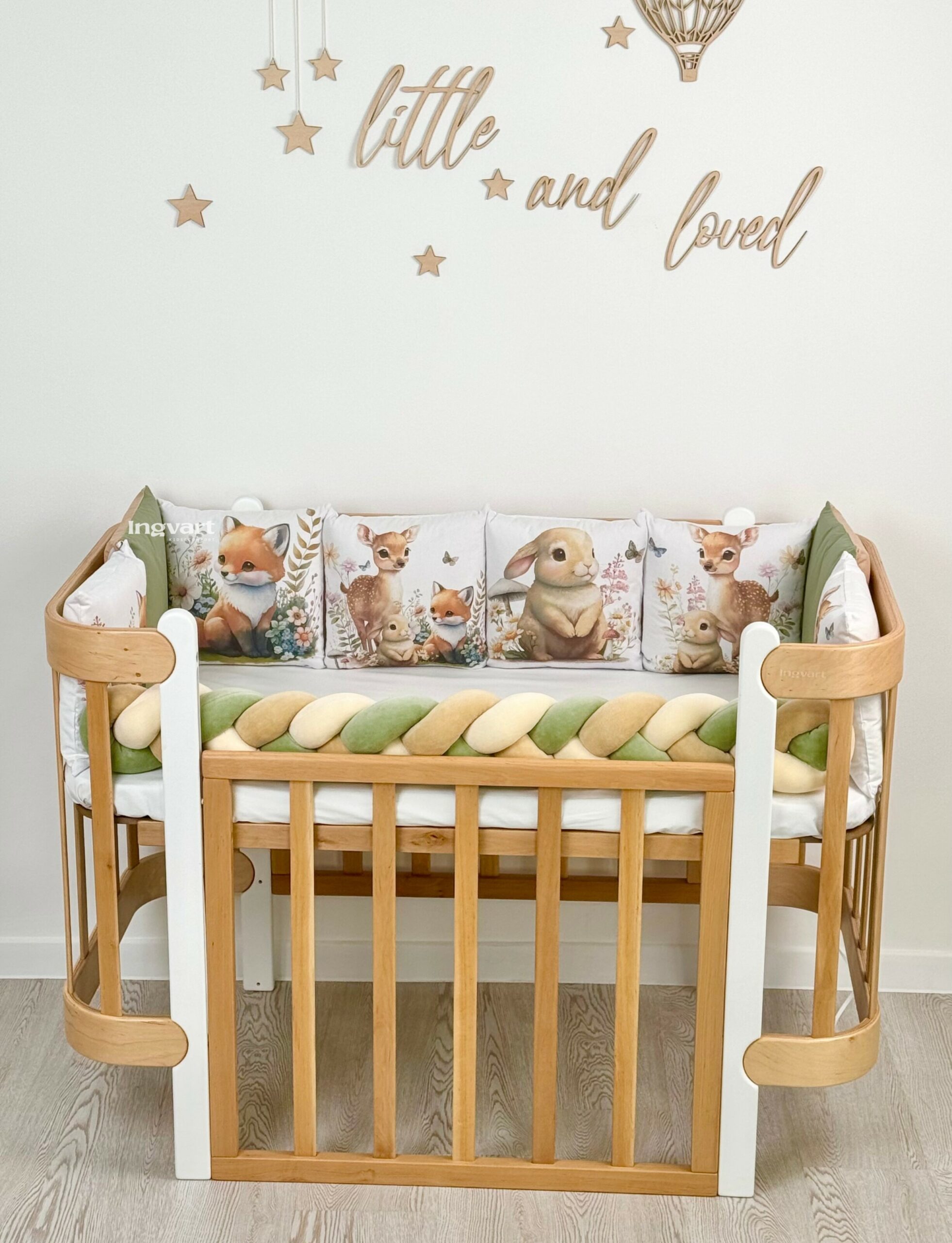 El conjunto incluye: – 8 almohadas laterales 30×30 cm +-2 cm – lado trenzado (material de terciopelo, relleno de fibra hueca) 120 cm +-2 cm – funda nórdica 110×90+-2 cm – manta 110×90+-2 cm – almohada de cabeza 40×60 cm + – 2 cm – funda de almohada 40×60 cm +-2 cm – sábana 60/70×120 cm con elástico en todo el perímetro (se selecciona el ancho) El conjunto se envía en una maleta transparente con asas.
