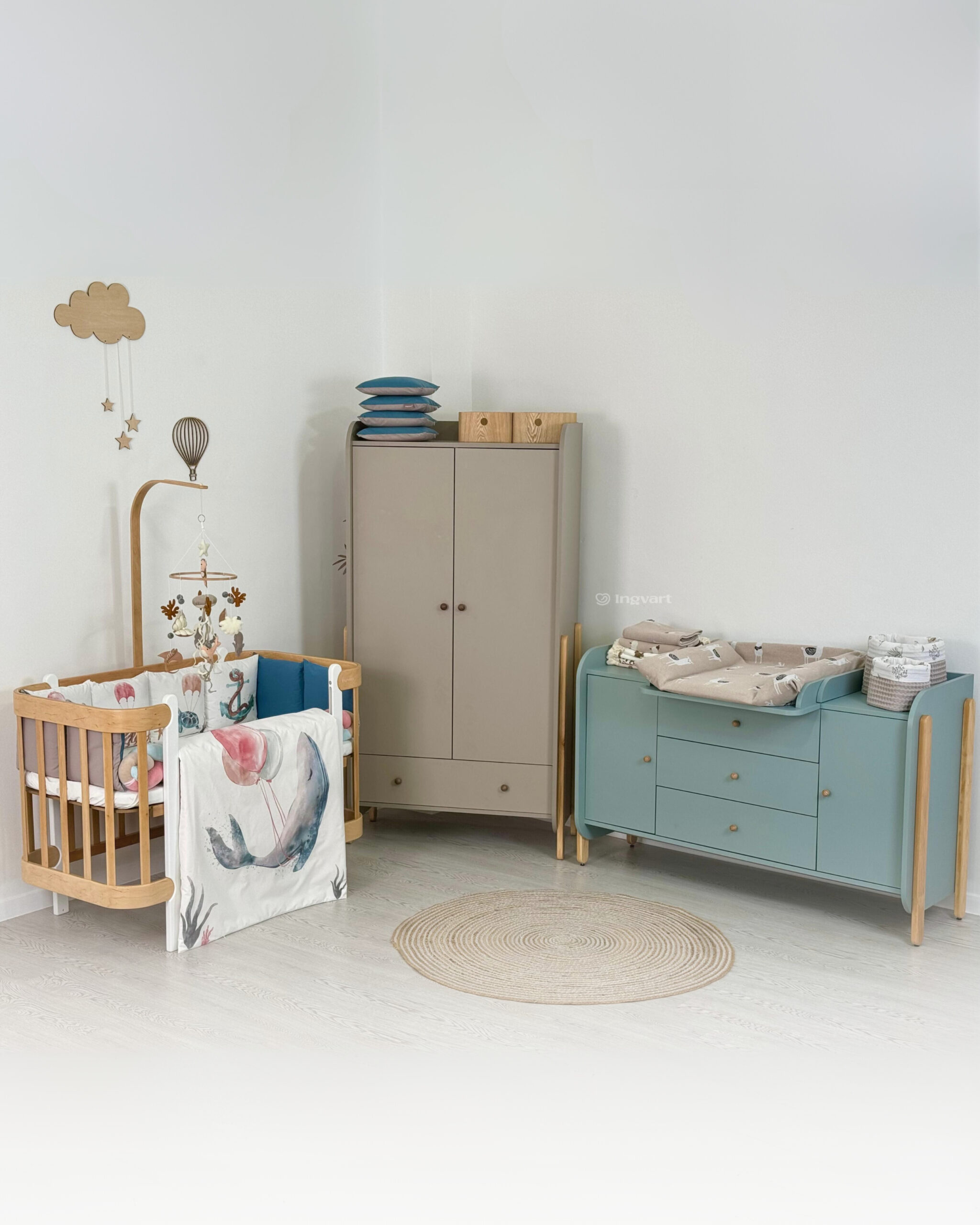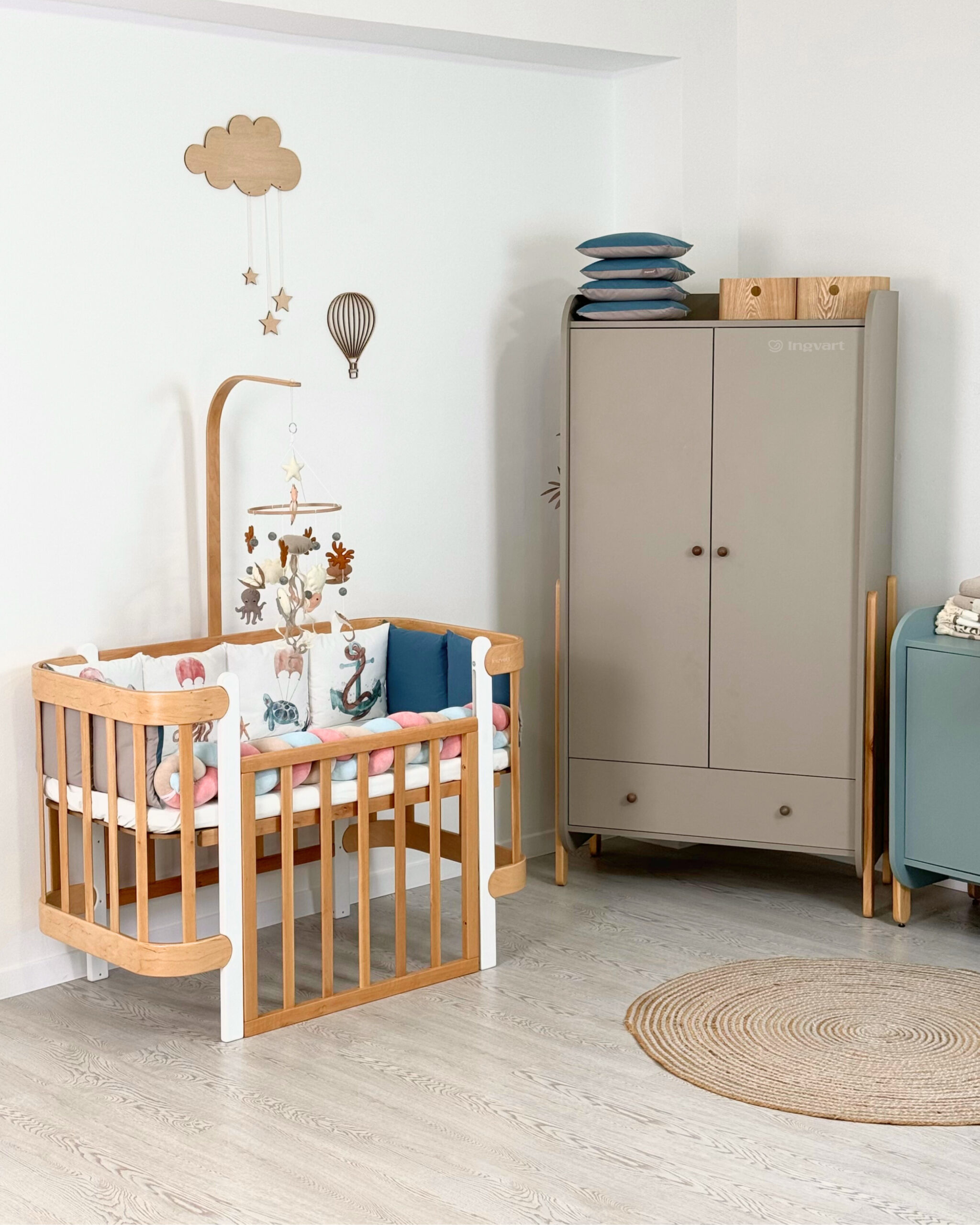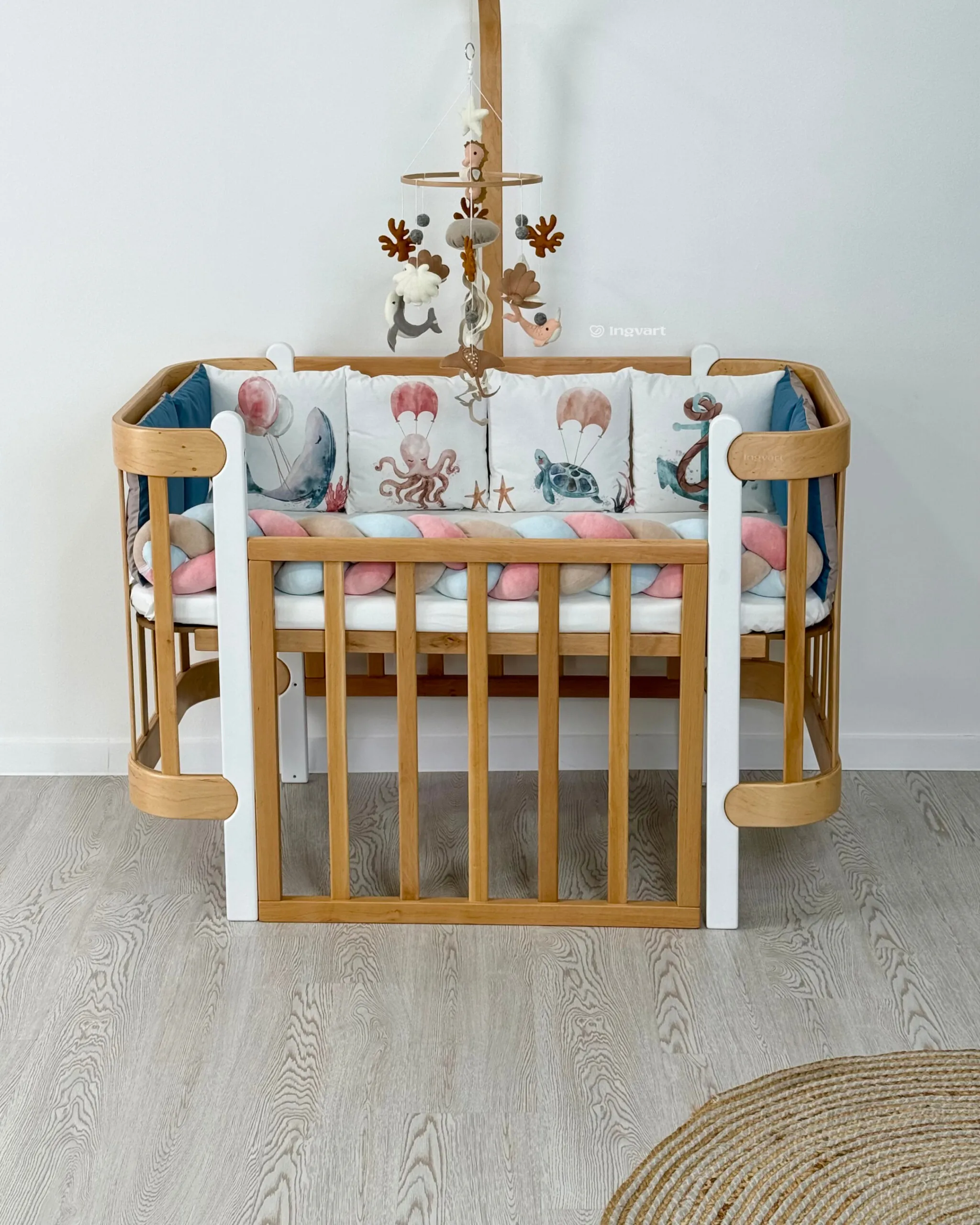 В набор входят: – 8 подушек бортиков 30х30 см +-2 см – бортик-коса (материал велюр, наполнитель холлофайбер) 120 см +-2 см – пододеяльник 110х90 +-2 см – одеяло 110х90 +-2 см – подушка под голову 40х6 см +-2 см – наволочка 40х60 см +-2 см – простыня 60/70х 120см на резинке по всему периметру (размер ширины выбирается) Комплект упакован в прозрачный чемодан с ручками